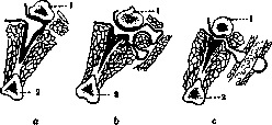 а—интерстициальная; Ь—позадигребенчатая; с—впередигребенчатая; 1—лобковая кость; 2—седалищная кость. отверстие, образуемое лобковой и седалищной костями, не доходит до верхнего края запирательного отверстия, и между ними остается нек-рое пространство. Свободный край перепонки располагается как-раз под тем местом лобковой кости, где в ней имеется жолобок, известный в анатомии под именем запирательного жолобка. Запирательный канал имеет косое направление, одинаковое с паховым каналом. Верхнюю стенку его, а отчасти и боковые образует лобковая кость, а именно sulcus obturatorius ее, нижнюю же—та клетчатка, к-рая лежит между двумя запирательными перепонками. Канал этот, по Майдлю (Maydl), имеет около 3 см длины, а по Шмидту (Schmidt)—1,5 см. Ширина его не представляет постоянной величины, но в среднем равна 1 см. Т. о. запирательный канал представляется костно-пе-репончатым, мало податливым и является местом для ущемления Г. Покрывающая его брюшина представляет нередко небольшое углубление, а иногда здесь находили ясно выраженный, дивертикул брюшины. Переднее отверстие запирательного канала не имеет вида сплошного кольца, а представляет собой два отдельных полукольца—верхнее, образованное лобковой костью, и нижнее, образованное верхним краем наружной запирательной мышцы. Отверстие это закрыто глубокой фасцией бедра. В запирательном канале находятся запирательный нерв (п. obturator.), запирательные артерия и вена (а. et v. obturator.), окруженные натровой клетчаткой. С практической стороны при ока- зании оперативной помощи следует различать 3 формы запирательной Г.: 1) когда Г. остается в запирательном канале (h. obtura-toria interstitialis, см. рисунок 7,«), 2) когда Г., выйдя из запирательного канала, остается лежать под гребенчатой мышцей (h. obtura-toria recto-pectinea, см. рисунок 7, 6), 3) когда Г., пройдя между гребенчатой и длинной приводящей мышцей бедра, помещается либо под широкой фасцией бедра либо выходит в подкожную клетчатку (h. obturatoria antepectinea, см. рисунок 7, с). Как содержимое запирательной Г. чаще всего находили тонкую кишку, одну или с сальником, а при ущемлении чаще всего встречали часть кишечной стенки.— Этиология. Запира-тельная Г. гораздо чаще встречается у женщин и редко у мужчин. Она свойственна пожилому возрасту. Справа запирательная Г. встречается чаще, чем слева. Нередко она наблюдалась с обеих сторон. Частота наблюдения запирательной Г. у женщин объясняется 1) резче выраженным наклоном таза, 2) большей величиной таза и 3) большей величиной запирательного отверстия. В числе анат. причин предрасположения к запирательной Г. следует признать существование брюшинного дивертикула.—Д и а г-н о з запирательной Г. устанавливался далеко не часто: на 107 ущемленных Г. Эн-глиш (Englisch) насчитал только 25 верных диагнозов и 12 предположительных. Что касается неущемленных Г., то следует различать скрытые, невидимые и явные формы. Первые не дают никаких симптомов, ни субъективных, ни объективных, у вторых отсутствует опухоль. Характерным признаком запирательной Г. считается симптом Гаушип-Ромберга (Howship-Romberg), который состоит в появлении боли по тракту запирательного нерва вследствие давления на него Г. Боль эта может локализоваться только в верхней части бедра на срединной и передней его поверхности, но может также иррадиировать как вверх, распространяясь иногда по всему животу, так и вниз, д