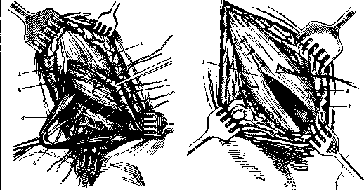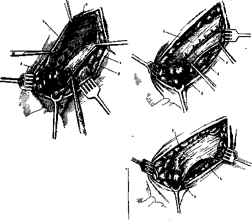 Рисунок 14. Операция паховой грыжи по Gi-rard'y: / и 2—внутренний и наружный листки апоневроза наружной косой мышцы; 3— lunlc. spermat.; i—Пупартова связка; 5—m. obliq. abdom. int.