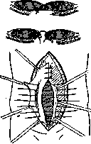 Рисунок 18. Операция почной грыжи по способу Lexer'a. По зашивании нруговым швом пупочного кольца шелковыми швами сближаются прямые мышцы выше и ниже пупка. продольно вторым слоем сшиваются прямые мышцы. Затем поперечно сшиваются передние листки влагалища прямых мышц. Большие пупочные Г., особенно у много-рожавших женщин, часто комбинируются с растяжением белой линии и общей дряблостью брюшной стенки. Обширные, часто многокамерные грыжевые мешки содержат помимо сальника кишечные петли, нередко плотно сросшиеся со стенкой мешка. Рецидивы после операций в таких случаях бывают очень часты (до 40 %, по Eiselsberg'y). Стремление поднять резистентность белой линии вызвало предложение мышечной пластики (Dauriac, Волкович, Салищев и др.). Предложения эти не приобрели сторонников. Популярнее методы апоневротической пластики (Са-пежко и др.). Мартынов применяет в этих целях следующую операцию. По иссечении избытка кожи обнажается апоневроз прямых мышц вправо и влево. На всем протяжении раны делается разрез, идущий приблизительно на 1—2 см к середине от края левой прямой мышцы и вскрывающий брюшную полость. Так. обр. получаются два неодинаковых брюшинно-апоневротич. лоскута. Края апоневроза справа и слева сильно оттягиваются в сторону, — тогда выступают края прямых мышц. На края мышц накладывают ряд швов, мышцы сближают до сопри-косрговения, но без вскрытия их влагалищ. Свободный край апоневроза правой прямой мышцы накладывается спереди и пришивается на всем протяжении передней поверхности апоневроза левой мышцы (см. рисунок 19).—Требует отдельного упоминания операция по поводу эмбриональных пупочных Г.* В тех случаях, когда эмбриональный дефект в брюшной стенке замещен полупрозрачной пластинкой с остатками амниона на наружной поверхности, оперативное вмешательство должно быть срочным тотчас после рождения, так как указанная пластинка быстро некротизируется. Операция состоит в удалении эмбриональной пластинки и закрытии дефекта послойным сшиванием стенки живота. При больших дефектах из-за невозможности стянуть мышцы приходится огра-