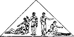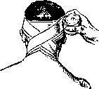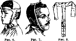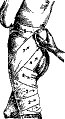 Рисунок 4. с обоих концов не до самой середины, так что получаются 4 конца. Пращевидная повязка удобна для быстрого прикрытия выпуклых частей головы—затылка, лба, подбородка, носа. Цельная часть ее прикрывает место повреждения, а перекрещенные концы связываются на отдаленной стороне (см. рисунок 6, 7). — Четырехугольная повязка накладывается при помощи квадратного куска ткани, сложенного пополам, но не совсем симметрично. При наложении ее на голову четыре угла свисают вниз; из них наружные связываются под подбородком, а внутренние выводятся вперед и завязываются сзади на шее. — Т-образная повязка представляет собой букву Т,сделанную из широких полос ткани. Применяется при перевязке носа, промежности, для поддержания мошонки вместо суспенсо-рия (см. рисунок 8). Бинтовая повязка заключается в обматывании части тела слоями длинной полосы ткани, предварительно плотно скатанной при помощи особой простой машинки или рукой. Ткани для изготовления бинта могут быть самые разнообразные. Среди них наиболее частое применение находит т. н. марля, т. е. хлопчатобумажная клетчатая