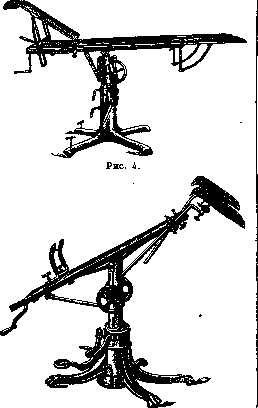 операциях на промежности и заднем проходе применяются ногодержатели (см. ниже), привинчиваемые к ножному концу О. с. Стоимость О. с. с перечисленными усовершенствованиями очень высока (около 2 500— 3 000 герм, марок). Следует отметить, что многие хирурги, отдавая должное перечисленным усовершенствованиям в новейших О. с, предпочитают оперировать на более простых О. с. типа Гана (рис. 4), преимуществом к-рых является отсутствие сложных меха-