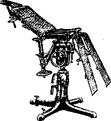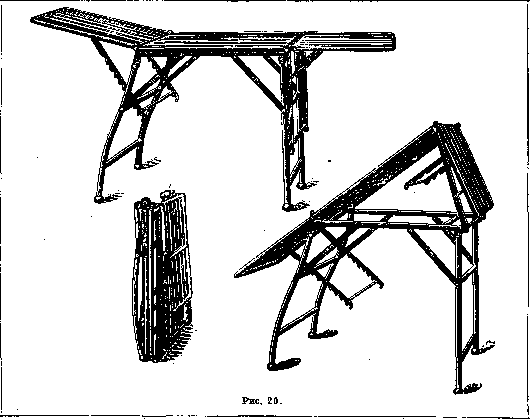 нических приспособлений, способствующее более легкой их дезинфекции. Не малым преимуществом стола Гана является также его дешевизна. В СССР в наст, время изготовляются операционные столы стандартного типа по типу Гана (рис. 3) с ручным или масляным подъемником. В условиях военного времени в подвижных полевых госпиталях можно пользоваться различными складными операционными столами (рис. 20) по типу стола Тильманса. н. Бяументаль.