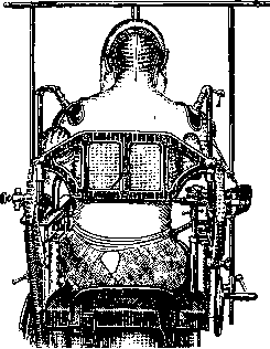 Рисунок 19. (выемками). Второй стержень может быть выдвинут на большее или меньшее расстояние и укреплен в этом положении винтом, находящимся около .центрального конца полого стержня. К наружным концам обоих стержней прикреплены кольца из широкого ремня, которым обшиты изогнутые металлические пластинки, застегивающиеся при помощи узких ремешков и металлических застежек. Максимальное же сги-