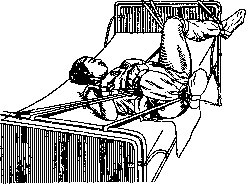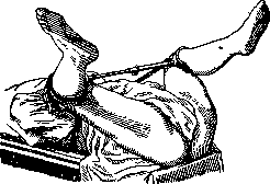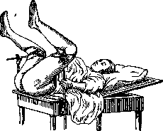 с таким расчетом, чтобы нижние конечности, согнутые в коленных и тазобедренных суставах и поднятые при этом на нужную высоту, были достаточно приближены к передней брюшной стенке и раздвинуты в стороны. Кроме того применением ногодержа-
