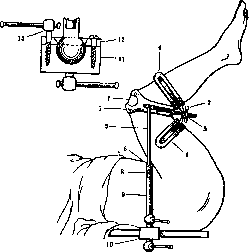 Рисунок 24. Ногодержатель Мартова: две штанги по бокам (6 и 8) из полых трубок. Одна трубка (3) вдвигается в другую (9) по мере надобности. С обеих сторон штанги с трубками прикреплены вверху и внизу по типу шаровидного суставного закрепления, что дает возможность благодаря кратерообразной крышке (12) и посредством зажима (13) придать любое направление штанге (9) и кольцу (4) во всех плоскостях. Зажим для фиксации ногодержателя к столу (10 и И) деревянному и металлическому, что является одним из существенных преимуществ ногодержателя для работы в условиях участковой практики. Гнездо из кожи для коленной чашки (1 и 7). Приспособление (4), при помощи которого, действуя гайкой (2 и 5), можно придать любое ^положение коленному сгибу (во избежание застоя крови).