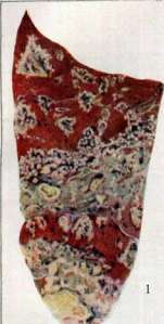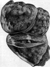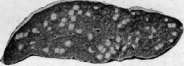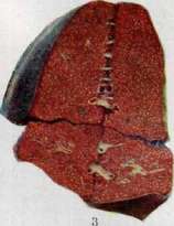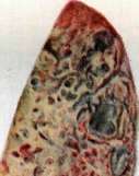 Рис, t». СолнтирлиП lIic селезенки. Рисунок Г, ТуберЦДОЭ яичко н ирндйтки, К ег+ Туберкулы. щиеся казеозу, могут претерпеть обратное развитие, т. е. рассасывание. Они могут также карнифицироваться с организацией эксудата специфической и неспецифической соединительной тканью. Чаще всего однако происходит творожистое перерождение как эксудата, так и альвеолярных перегородок (щадится лишь упругая ткань последних); казеоз начинается в отдельных районах пневмонической области, которые при этом приобретают желтоватый, сухой, непрозрачный вид, а потом захватывает всю пневмоническую область сплошь. Если б-ной не умирает в этом периоде лобарной туб. пневмонии, в области ее появляются множественные очаги размягчения, распада с образованием синуозных, наполненных гноевидной массой полостей. Туб. пневмонии иногда еще выражаются в т. н. желатинозной инфильтрации; под этим подразумевают туб. пневмонию долевую или меньшего протяжения, в к-рой эксудат не подвергается казеозу, а претерпевает особый вид разбухания, благодаря к-рому приобретает сходство с желатиной. На поверхности разреза весь район пневмонии имеет желтоватый, полупрозрачный, желатиноподобный вид. В таком состоянии пневмония может пребывать очень долго, не сопровождаясь никакими клеточными и ферментативными реактивными проявлениями. Лишь в дальнейшем наступает вяло развивающееся творожистое перерождение. При распространенном туб. процессе в одном легком другое легкое редко остается пощаженным; чаще всего в нем возникают бронхогенные очаги ацинозного и лобарного типа.—В течение легочного Т. взрослых могут еще вспыхивать перифокальные инфильтраты в виде колятеральной серозной пневмонии, окружающей очаги туб. процесса. Нередки также эпитуберкулезные инфильтраты, под к-рыми подразумевают (Eliasberg, Pagel, Schilrmann) районы ателектаза легочной ткани, являющиеся следствием сдавления или закупорки соответствующего бронха; как показывают наблюдения рентгенологов, эпитуберкулезные инфильтраты (ателектазы) могут при устранении препятствия в бронхе ликвидироваться; в противоположных случаях они подвергаются спленизации и инду-рации. Осложнение легочной чахотки инфекцией различными посторонними бактериями присоединяет к Т. элементы различных банальных пневмоний, нагноений, ихорозных и гангренозных процессов. Все вышеперечисленные слагаемые пат. анатомии легочной чахотки взрослых могут сочетаться самым различным образом, что дает крайне разнообразные и пестрые пат.-анат. картины Т. легких у взрослых. При вскрытии трупа б-ного, умершего от легочной чахотки, обычно находят в верхней части верхней доли более старые изменения в виде индурирован-ной, богатой углем легочной ткани с бронхо-эктазами и с сухими творожистыми, нередко омелотворенными очагами; обычно тут же находится каверна с гладкими фиброзными стенками или с казеозной внутренней поверхностью (подробнее о кавернах см. Каверны). Ниже видны казеозные фокусы разных размеров или распадающиеся с образованием каверн и нерезко ограниченные от соседней ткани или же сухие, окруженные плотной соединительной тканью, переходящей без резких границ в индурированную легочную ткань. Еще ниже находятся сливающиеся, а в более нижних отделах—изолированные ацинозно-нодозные фокусы; наконец в самых нижних частях легких— лишь рас