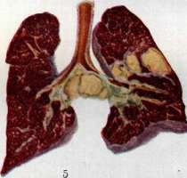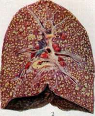гематогенной генерализацией в результате проникания туб. бацил в ток крови непосредственно или через посредство лимфы (см. Туберкулез). В легких гематогенное поражение проявляется разно. При обшем милиарном Т. в обоих легких наблюдается высыпь массы милиарных туберкулов [см. отд. табл. (ст. 119—120), рис. 3]; в этих случаях ткань легких представляется полнокровной и на таком фоне видны бугорки в зависимости от возраста и типа их или мелкие, серые, полупрозрачные или желтые, с неровными контурами, часто более крупные. Нередко можно, согласно указанию Рибберта (1902), заметить, что у взрослых в верхних районах легких бугорки несколько более крупны, чем в нижних, что объясняют более энергичным ростом туберкулов именно в верхних отделах легких. Если проникание туб. бацил произошло в ветвь легочной артерии, то мидиариза-ция захватывает лишь соответствующую часть легочной территории. Микроскоп, исследование при милиаризации в легких может открыть разный тип бугорков: иногда это типичные продуктивные эпителиоидные бугорки, имеющие своим источником развития альвеолярные перегородки; бугорки растут, сдавливая и уничтожая альвеолы и оставаясь долго продуктивными бугорками; в других случаях к бугорку, начавшему развиваться в альвеолярной перегородке, быстро присоединяется эксудация в альвеолы; наконец бывает так, что бугорок как бы сразу возникает в виде милиарной пневмонии, захватывающей 2—4 соседних альвеолы (милиарный альвеолит), и таким образом обнаруживает экеудативный характер. Гюбшман и Шлейсинг выдвигают ту точку зрения, что всякий бугорок в легких начинается в виде милиарной пневмонии и уже потом окружается продуктивной зоной. Эта точка зрения вызвала категорические возражения крупнейших патологов (Герксгеймер, Ашоф, Штернберг и др.); кроме того Гретман (Grethmann, 1928) установил, что гематогенные милиарные бугорки в легких как правило развиваются в виде продуктивных бугорков из стенок мелких сосудов; эксудация в альвеолы есть явление последовательное, частое, но не обязательное. Гематогенное метастазирование в легкие может еще происходить в виде появления в легких одного или нескольких туб. очагов; по своему существу такая форма есть частное проявление органного T.j возникающего в порядке поздней генерализации первичного Т. (см. Туберкулез). Судьба и выражение таких отдельных гематогенных фокусов в легких бывает разной (см. ниже). Попытка Симона (Simon) объяснить все верхушечные рубцы, встречаемые в легких взрослых, гематогенным метастазированием, происходящим в детстве, у патологов не имела успеха; такое гематогенное метастазирование в верхушку легкого в детском возрасте встречается редко и на детских трупах мы не встречаем ничего похожего на начало образования этих очагов; верхушечные рубцы легких наблюдаются почти только у взрослых, и частота их возрастает с возрастом. Первичный Т. приводит к смерти детей или в связи с значительным распространением туб. процесса в легких или в связи с генерализацией, особенно в виде общего милиарного Т. и туб. менингита, У взрослых первичный Т. легких бывает очень редко; чаще всего это касается тех народностей, к-рые в детском возрасте не соприкасаются с туб. вирусом (см. Туберкулез).—В торичный Т. легких представляет собой то, что принято выделять в качестве легочной чахотки взрослых; по сущес