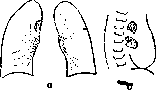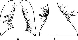 Рисунок 3. Сифилис легкого (схема). Склеротически-пневмонический процесс с участием плевры: а — дорсо-вентральный снимок; б — в положении по Флейщнеру (запрокидывание корпуса назад).