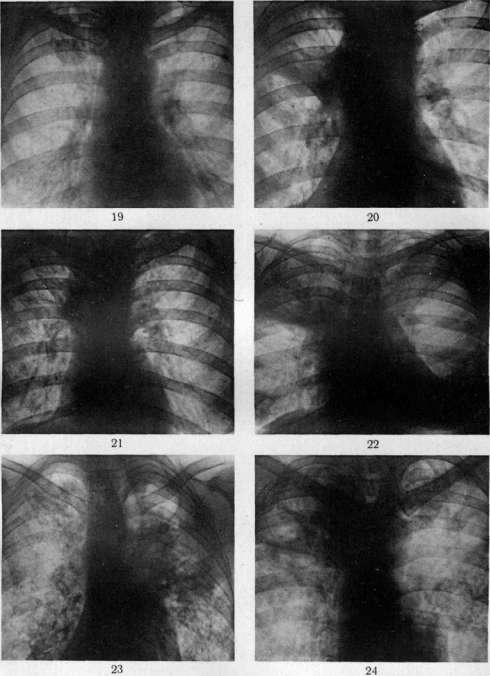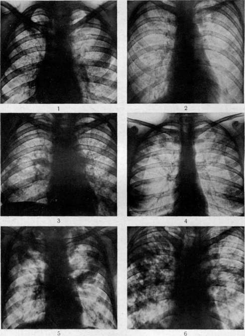 ПВДОСТрОЯ милнаркзацнн^ Рисунок 3. Хроническая доброкачественная ддесвннншцп а обоих легких со *imаннонлнкай* каверной спрлпа. Рисунок 4. Очажки продуктивного tbc н нерянкх отделах обоих легких. Рисунок 5. Х.юньенндные теии тЕюрожнстоД пневмонии. Рисунок 6, Х.юльевндные тени творожистой нпенмокнн с просветлениями мелких каверв справа.