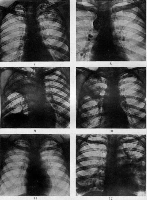 лобнт справа с канерной под ключицей: начало рассасывания и фиброзного iipenpauR-HHftr Рнс, L0. Тень «перненнссурнта* н нижней части правой верхней доли. Рис 11. Сеть перплобулнта н верхней доле ирапого легкого. Ряс. 12. Каверна с дренаж пин бронхом в неркнеи доле левого легкого. Фнбро-кавернозные изменения.